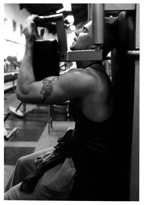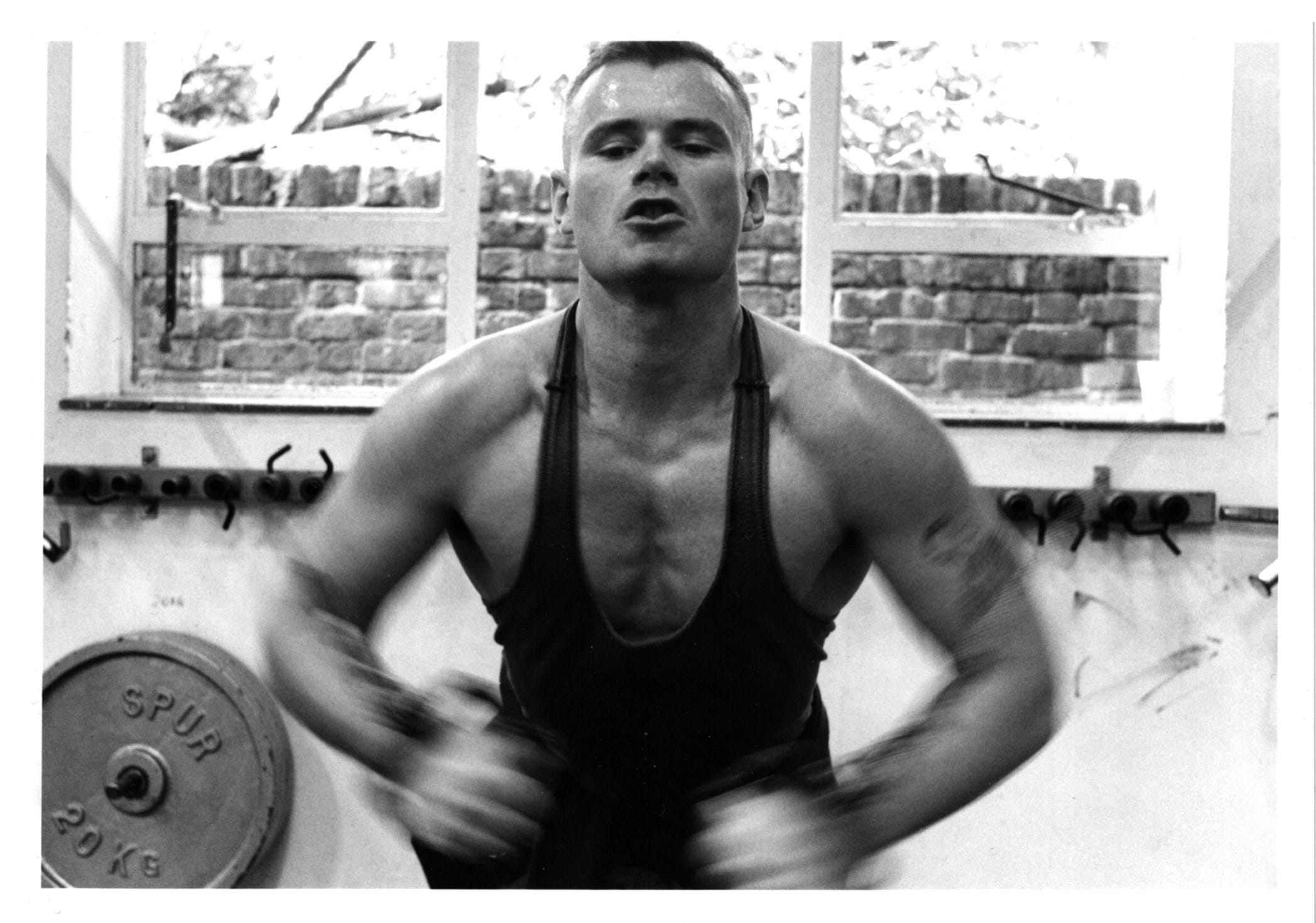 Taken in a gym in Tufnell Park, North London, by the photographer Rena Pearl (her name is on the back of the prints she kindly provided me with), they show me working out in my favourite stringer.